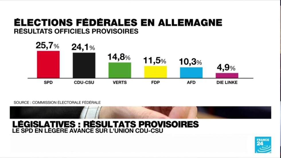 Selon les premiers résultats officiels provisoires diffusés lundi matin sur le site de la commission électorale, le centre-gauche du SPD et leur chef de file, Olaf Scholz, ont recueilli 25,7 % des suffrages, devançant de peu l'union conservatrice CDU-CSU d'Armin Laschet, qui accuse un score historiquement bas de 24,1 %.